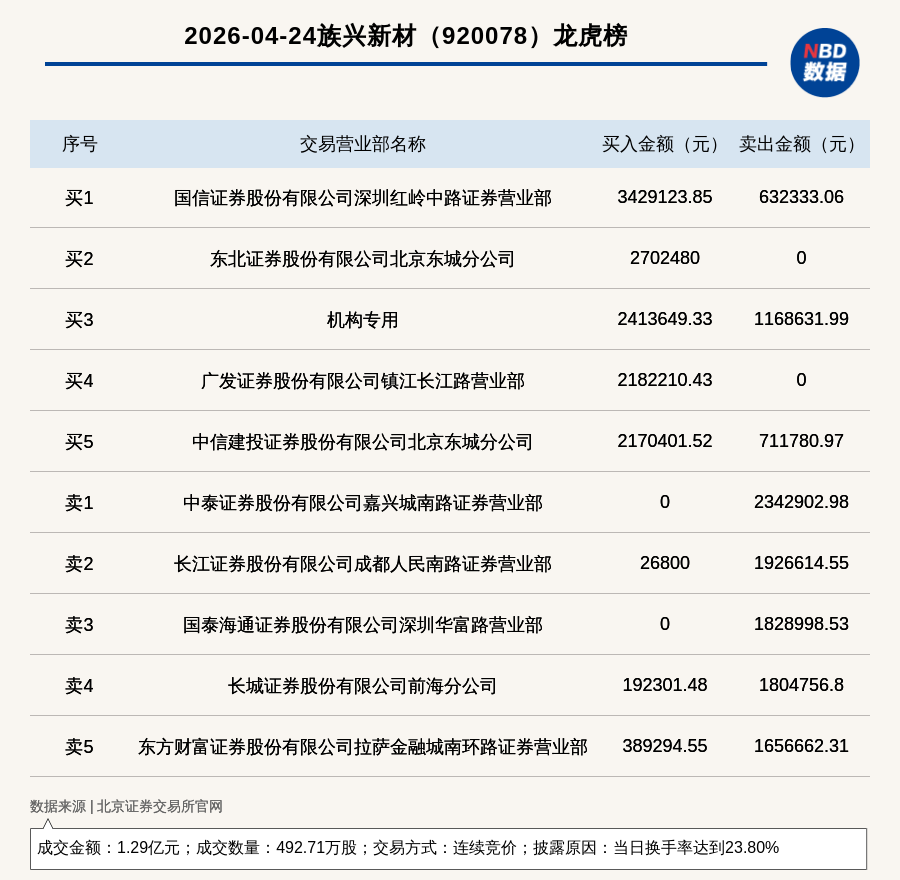 每经讯,2026年4月24日,北交所上市公司族兴新材(920078,收盘价:25.62元)登上龙虎榜,交易方式是连续竞价,披露原因是当日换手率达到23.80%,成交数量492.71万股,成交金额1.29亿元。买一席位为国信证券股份有限公司深圳红岭中路证券营业部,买入342.91万元;卖一席位为中泰证券股份有限公司嘉兴城南路证券营业部,卖出234.29万元。