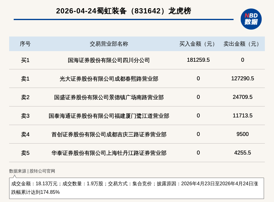 每经讯,2026年4月24日,新三板创新层公司蜀虹装备(831642,收盘价:13.77元)登上龙虎榜,交易方式是集合竞价,披露原因是2026年4月23日至2026年4月24日涨跌幅累计达到174.85%,成交数量1.9万股,成交金额18.13万元。买一席位为国海证券股份有限公司四川分公司,买入18.13万元;卖一席位为光大证券股份有限公司成都春熙路营业部,卖出12.73万元。