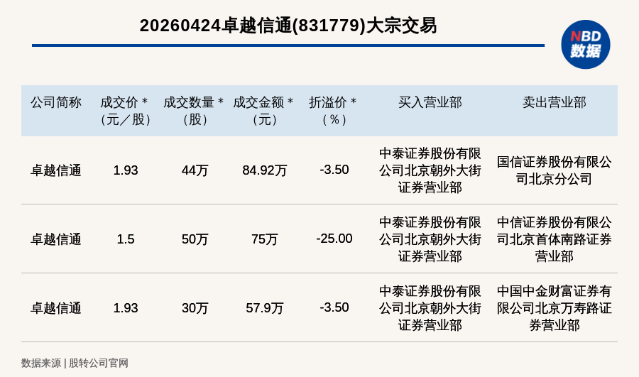 每经讯,2026年4月24日,新三板创新层公司卓越信通(831779,收盘价:2元)发生3笔大宗交易,总成交金额为217.82万元,成交金额最高的一笔成交价1.93元/股,成交数量44万股,成交金额84.92万元,折价3.5%。买入营业部是中泰证券股份有限公司北京朝外大街证券营业部,卖出营业部是国信证券股份有限公司北京分公司。