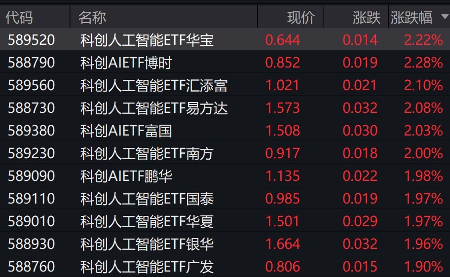 受盘面影响,科创人工智能相关ETF涨约2%。
