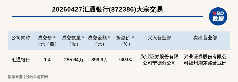 每经讯,2026年4月27日,新三板创新层公司汇通银行(872386,收盘价:2元)发生一笔大宗交易,成交价1.4元/股,成交数量285.64万股,成交金额399.9万元,折价30%。买入营业部是兴业证券股份有限公司宁德分公司,卖出营业部是兴业证券股份有限公司福州湖东路营业部。
