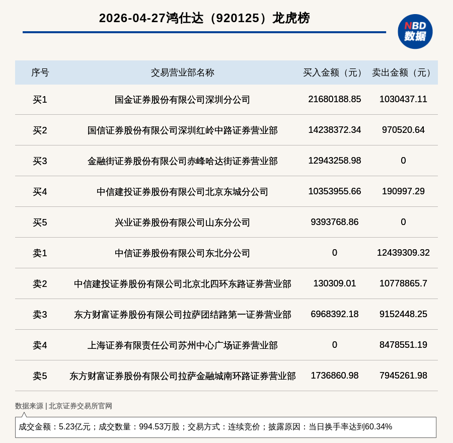 每经讯,2026年4月27日,北交所上市公司鸿仕达(920125,收盘价:53.82元)登上龙虎榜,交易方式是连续竞价,披露原因是当日换手率达到60.34%,成交数量994.53万股,成交金额5.23亿元。买一席位为国金证券股份有限公司深圳分公司,买入2168.02万元;卖一席位为中信证券股份有限公司东北分公司,卖出1243.93万元。