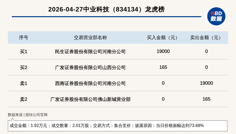 每经讯,2026年4月27日,新三板基础层公司中业科技(834134,收盘价:0.95元)登上龙虎榜,交易方式是集合竞价,披露原因是当日价格振幅达到73.68%,成交数量2.01万股,成交金额1.92万元。买一席位为民生证券股份有限公司河南分公司,买入1.9万元;卖一席位为西南证券股份有限公司河南分公司,卖出1.9万元。