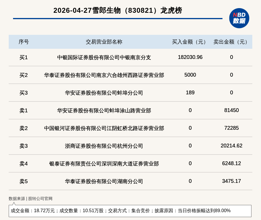 每经讯,2026年4月27日,新三板创新层公司雪郎生物(830821,收盘价:1.81元)登上龙虎榜,交易方式是集合竞价,披露原因是当日价格振幅达到89.00%,成交数量10.51万股,成交金额18.72万元。买一席位为中银国际证券股份有限公司中银南京分支,买入18.2万元;卖一席位为华安证券股份有限公司蚌埠涂山路营业部,卖出8.14万元。