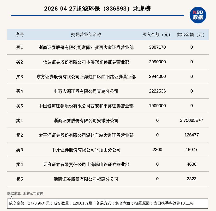 每经讯,2026年4月27日,新三板创新层公司超滤环保(836893,收盘价:23元)登上龙虎榜,交易方式是集合竞价,披露原因是当日换手率达到18.11%,成交数量120.61万股,成交金额2773.96万元。买一席位为浙商证券股份有限公司富阳江滨西大道证券营业部,买入330.72万元;卖一席位为浙商证券股份有限公司安徽分公司,卖出2758.85万元。
