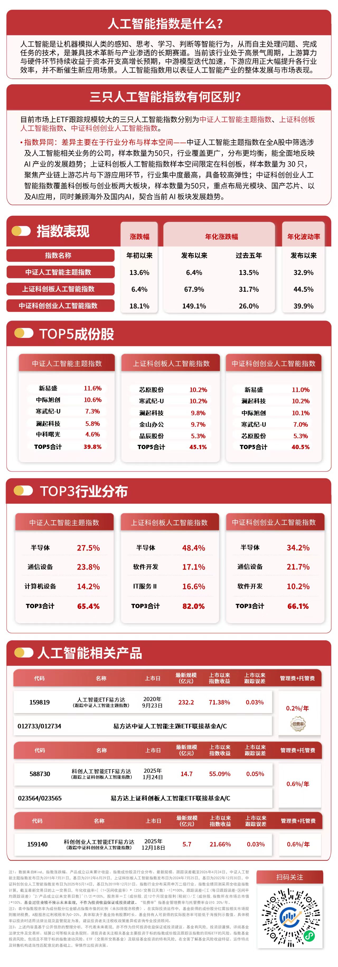 Wind数据显示,人工智能ETF易方达(159819,联接基金A/C:012733/012734)最新规模达232亿元,是全市场规模第一的人工智能主题ETF,且管理费率仅为0.15%/年,可助力投资者一键布局光模块、AI芯片、AI服务器、AI应用等人工智能全产业链环节。