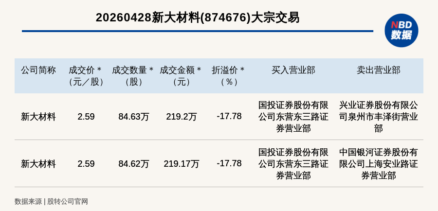 每经讯,2026年4月28日,新三板基础层公司新大材料(874676,收盘价:3.15元)发生2笔大宗交易,总成交金额为438.37万元,成交金额最高的一笔成交价2.59元/股,成交数量84.63万股,成交金额219.2万元,折价17.78%。买入营业部是国投证券股份有限公司东营东三路证券营业部,卖出营业部是兴业证券股份有限公司泉州市丰泽街营业部。