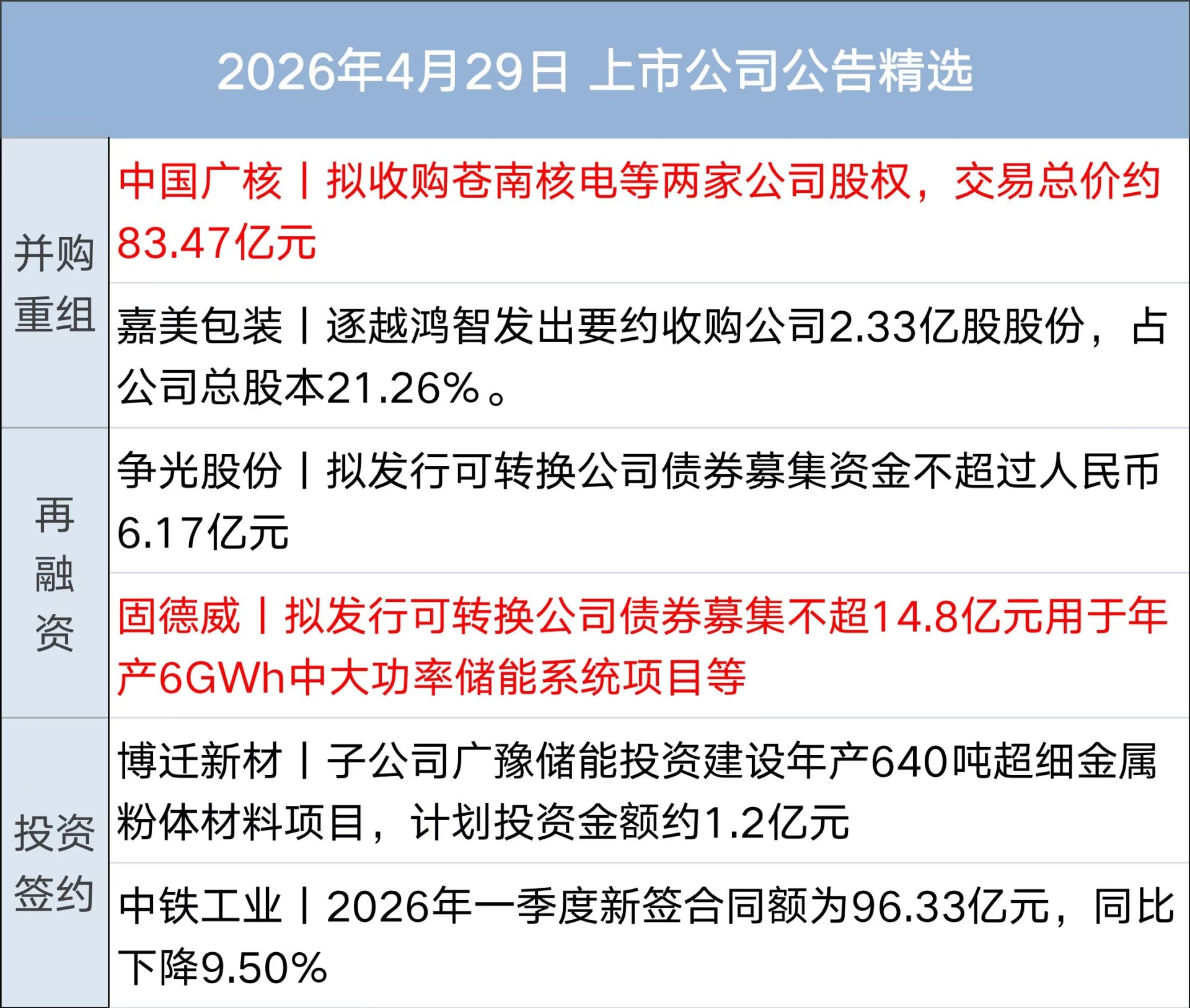 格力电器(SZ000651,股价38.44元,市值2153亿元):格力电器4月28日晚公告称,公司拟使用自有资金以集中竞价方式回购部分社会公众股,回购资金总额不低于50亿元且不超过100亿元,回购价格不超过56.55元/股。本次回购的股份不低于70%将用于注销并减少注册资本,剩余不超过30%用于员工持股计划或股权激励。回购期限自股东会审议通过之日起不超过12个月。