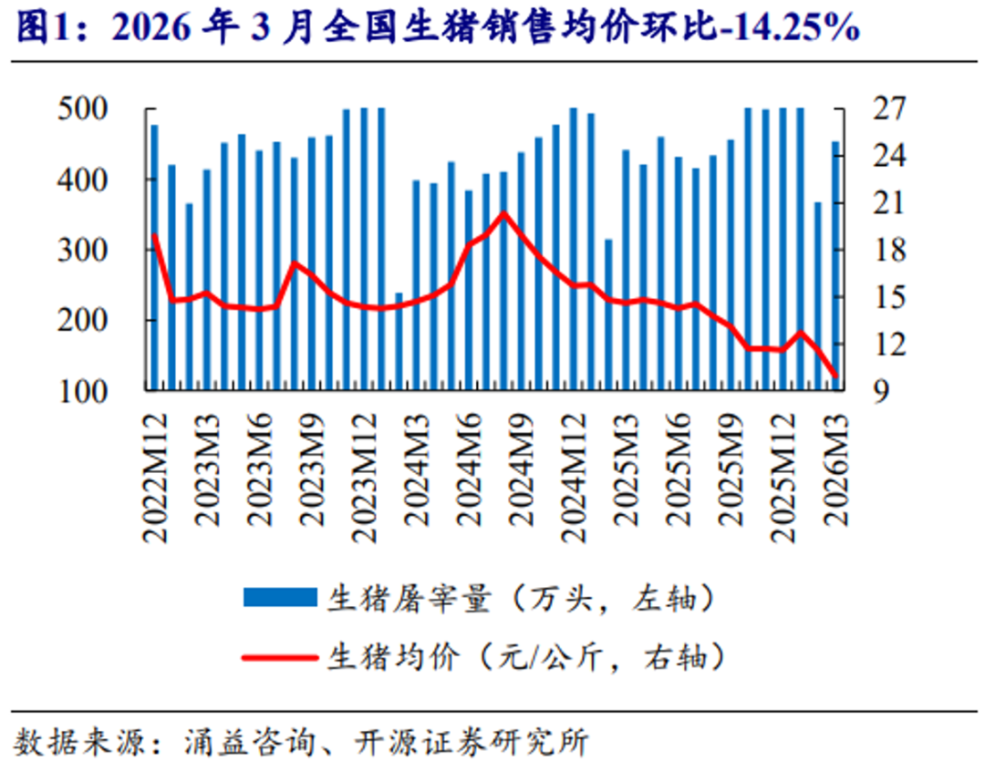 根据涌益咨询,2026年3月全国生猪销售均价9.96元/公斤,环比-14.25%,同比-31.85%。涌益监控样本2026年3月屠宰量453.84万头,环比+23.53%,同比+2.83%。涌益样本3月生猪出栏较计划完成率105.14%,4月计划出栏较3月实际出栏+3.07%。3月出栏超计划完成,主要系猪价快速下跌、行业亏损加深背景下养殖端出栏意愿提升,叠加前期递延猪源集中释放,部分养殖端倾向回笼现金并提前兑现供给压力。