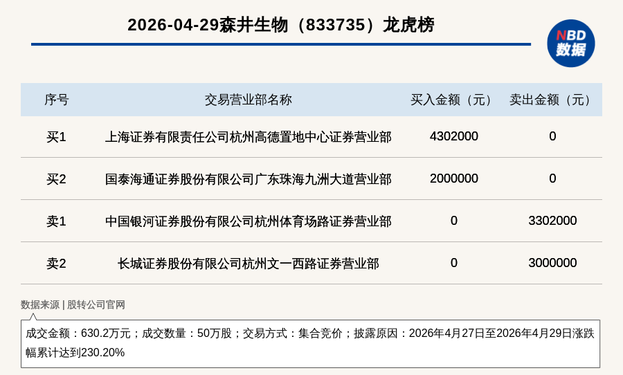 每经讯,2026年4月29日,新三板基础层公司森井生物(833735,收盘价:16.51元)登上龙虎榜,交易方式是集合竞价,披露原因是2026年4月27日至2026年4月29日涨跌幅累计达到230.20%,成交数量50万股,成交金额630.2万元。买一席位为上海证券有限责任公司杭州高德置地中心证券营业部,买入430.2万元;卖一席位为中国银河证券股份有限公司杭州体育场路证券营业部,卖出330.2万元。
