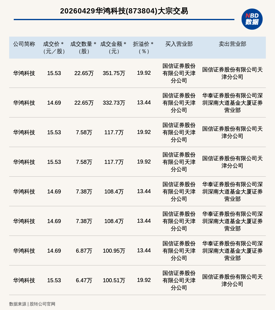 每经讯,2026年4月29日,新三板基础层公司华鸿科技(873804,收盘价:12.95元)发生8笔大宗交易,总成交金额为1338.14万元,成交金额最高的一笔成交价15.53元/股,成交数量22.65万股,成交金额351.75万元,溢价19.92%。买入营业部是国信证券股份有限公司天津分公司,卖出营业部是国信证券股份有限公司天津分公司。