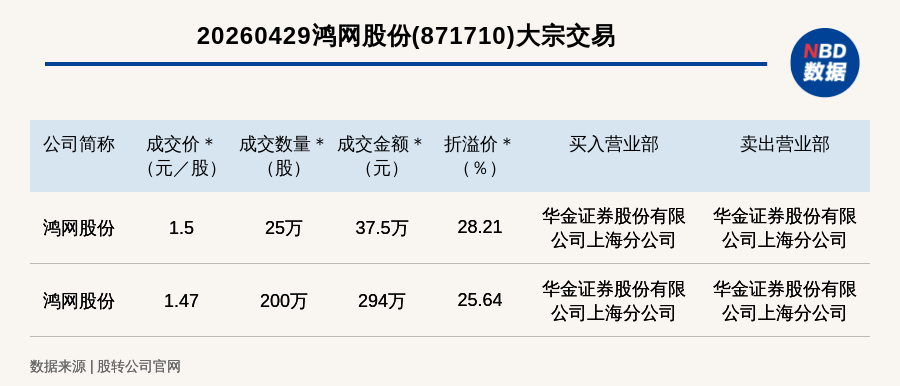 每经讯,2026年4月29日,新三板基础层公司鸿网股份(871710,收盘价:1.17元)发生2笔大宗交易,溢价率最高的一笔成交价1.5元/股,成交数量25万股,成交金额37.5万元,溢价28.21%。买入营业部是华金证券股份有限公司上海分公司,卖出营业部是华金证券股份有限公司上海分公司。