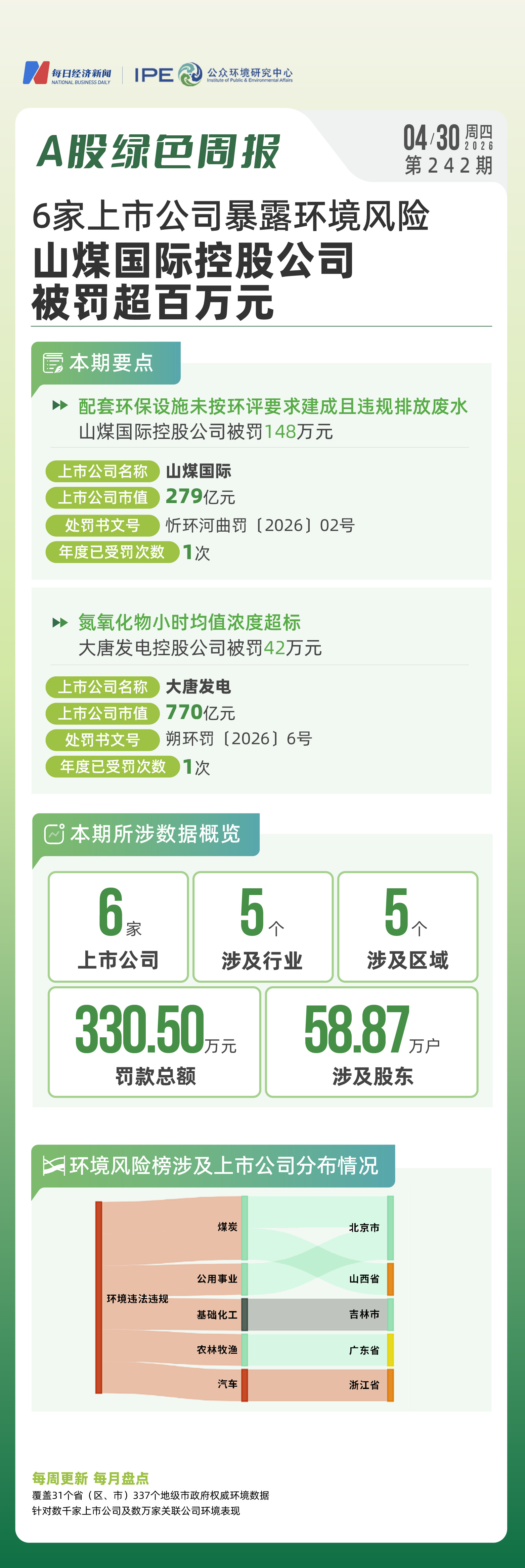 每日经济新闻联合公众环境研究中心发布A股绿色周报显示,2026年4月第五周,6家上市公司暴露环境风险。其中,山煤国际控股公司因环保设施未建成且违规排水被罚158.6万元;大唐发电控股公司因氮氧化物超标被罚42万元;金浦钛业控股公司因氨氮排放超总量被罚21.7万元。环境风险日渐成为上市公司重要经营风险之一。