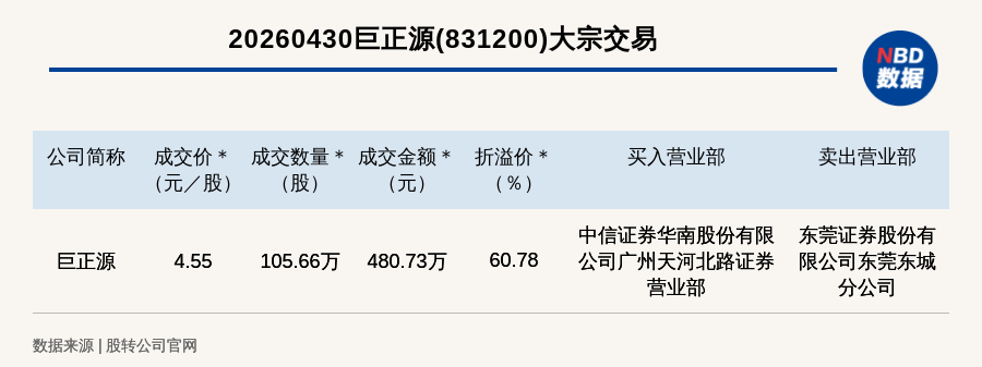 每经讯,2026年4月30日,新三板创新层公司巨正源(831200,收盘价:2.83元)发生一笔大宗交易,成交价4.55元/股,成交数量105.66万股,成交金额480.73万元,溢价60.78%。买入营业部是中信证券华南股份有限公司广州天河北路证券营业部,卖出营业部是东莞证券股份有限公司东莞东城分公司。